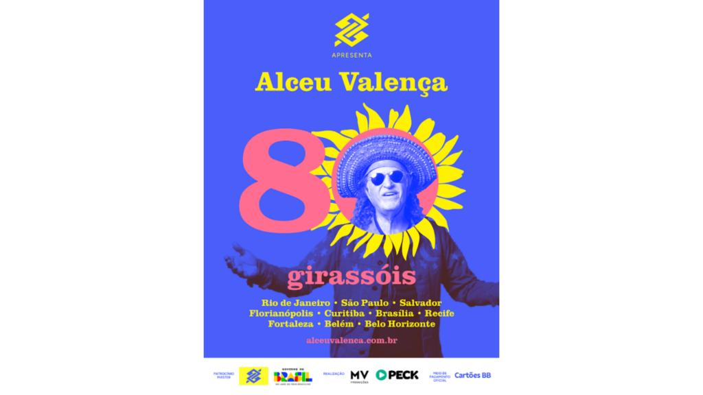 Em 2026, Alceu Valença comemora oito décadas de vida e, para celebrar a data, o artista percorrerá as cinco regiões do país com o espetáculo “Alceu Valença – 80 Girassóis”. O Banco do Brasil é patrocinador master do projeto, que estreia neste sábado, dia 14 de março, no Rio de Janeiro e segue para São Paulo (28/03), Salvador (10/04), Florianópolis (18/04), Curitiba (25/04), Brasília (09/05), Recife (15/05), Fortaleza (23/05), Belém (30/05) e Belo Horizonte (20/06). Em cada praça, a empresa promoverá ativações que conectam a marca ao universo do artista e à cultura do Nordeste, com foco na experiência e no encontro.