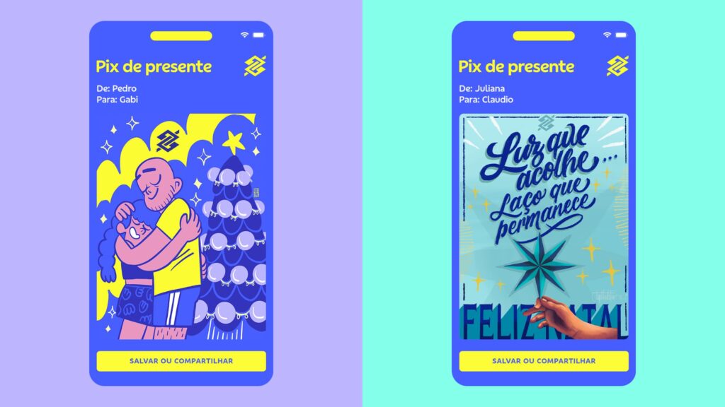 Por meio do aplicativo BB, o cliente pode optar por embrulhar o Pix de presente na Central do Pix, selecionar uma obra de arte em forma de cartão digital temático e redigir uma mensagem personalizada, tornando cada transferência única e memorável.