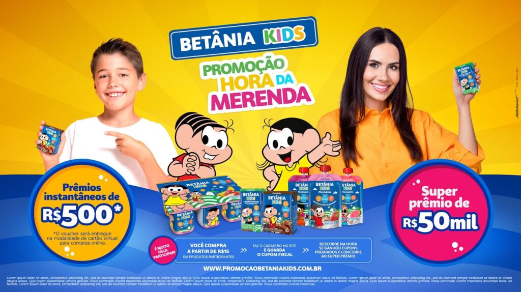 A promoção segue até junho e, para participar, basta adquirir R$ 15,00 em produtos das linhas de iogurte Bandeja Betânia kids, Merendinha, achocolatado e leite fermentado, e cadastrar a nota fiscal no site oficial promocaobetaniakids.com.br. Cada cadastro garante a chance de concorrer a 200 prêmios instantâneos de R$ 500,00 e números da sorte para o sorteio do prêmio final, no valor de R$ 50 mil.