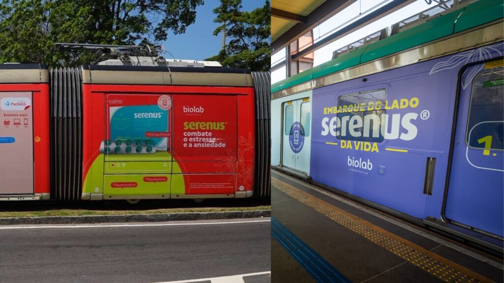 As peças adesivadas nos meios de transporte destacam o Serenus como protagonista, com imagens que reforçam a presença da marca nas ruas.