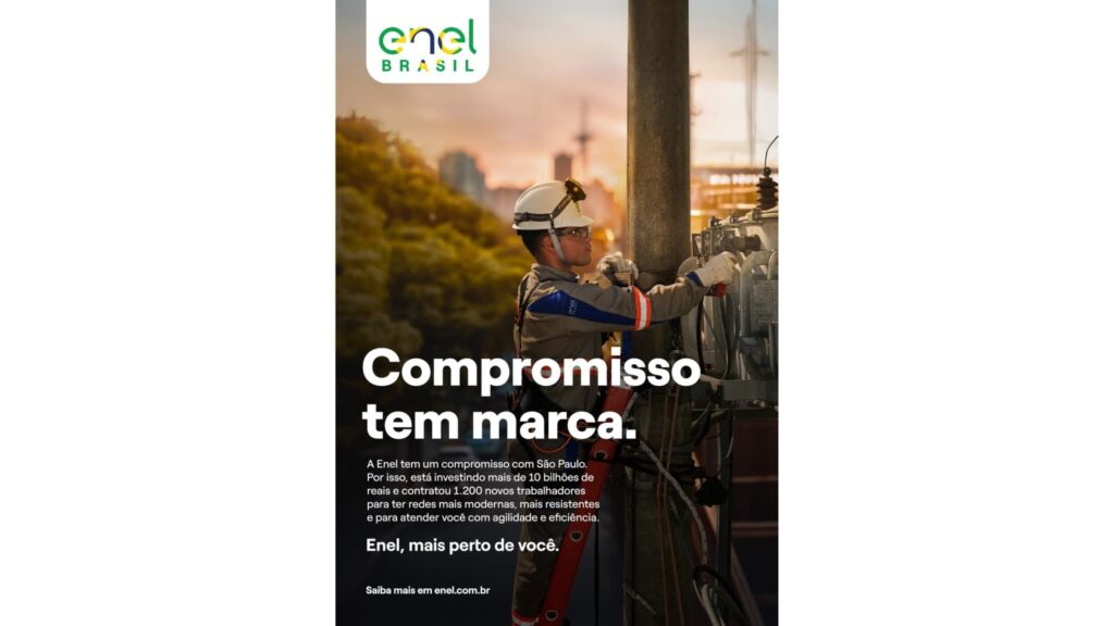 A Enel Brasil lança a campanha institucional “Compromisso tem marca. Enel, mais perto de você”. A iniciativa, criada e veiculada pela agência Leo Burnett, está diretamente ligada à mudança de marca da Enel, que trouxe para sua identidade visual as cores da bandeira do Brasil. O objetivo da campanha multicanal é reforçar o vínculo da companhia com os milhões de clientes de suas operações no país. Com foco em proximidade e prestação de contas, a campanha se estenderá até setembro de 2025, impactando os mercados estratégicos de São Paulo, Rio de Janeiro e Ceará – estados onde a companhia atua diretamente na distribuição de energia.