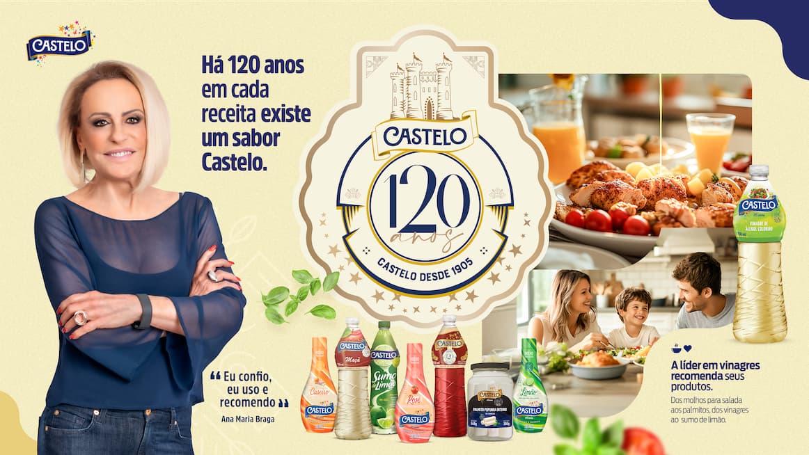 Em 2025, a Castelo Alimentos completa 120 anos de história. Para celebrar a data, o anunciante lança uma nova campanha institucional assinada pela agência CDR+. O objetivo é expandir é reforçar a presença da marca líder em vinagres em diferentes momentos à mesa dos brasileiros, trazendo recomendações de produtos de suas outras linhas.