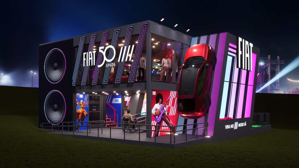 Fora da área principal, a Fiat estende sua presença com um Cardisplay que segue o mesmo conceito visual do estande e uma área de descanso, chamada Fiat Relax, espaço para o público visitar entre os shows. O local contará com puffs para descansar e pontos para carregar o celular.