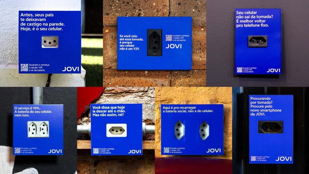 No total, mais de 50 tomadas foram customizadas em endereços estratégicos da noite paulistana, incluindo C do Padre, Baixo Pinheiros e Santa Augusta, com o objetivo de provocar quem está sempre à caça de um ponto de energia. A ação conta com placas que trazem frases como “Se você veio até essa tomada, é porque seu celular não é um Y29s 5G” e “Procurando por tomada? Procure pelo novo smartphone da JOVI”.