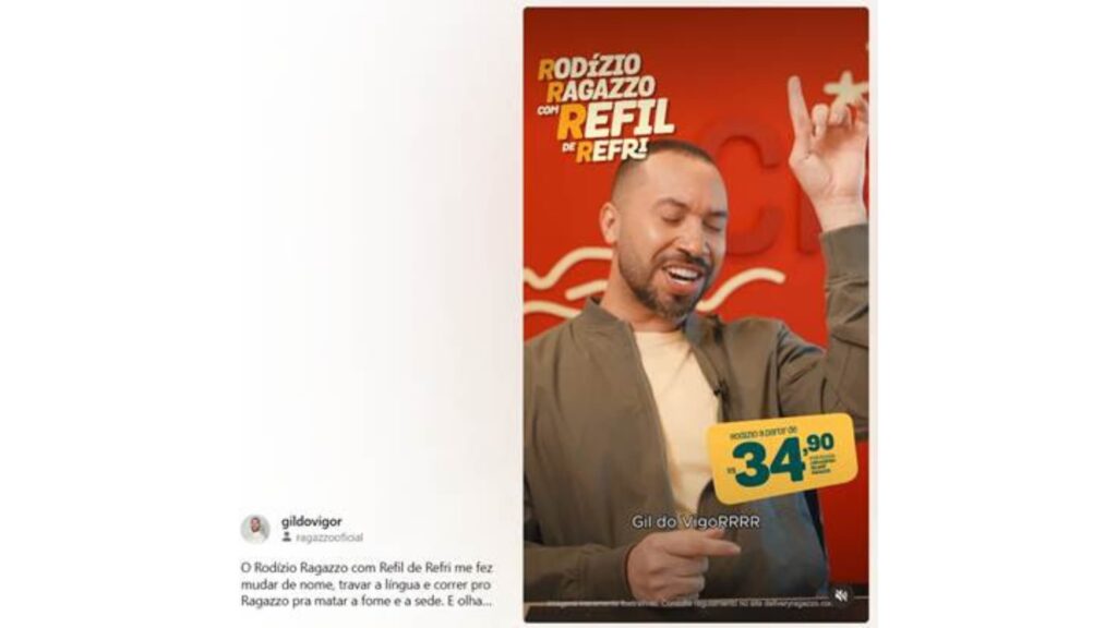 O Ragazzo dá um novo passo na sua estratégia de marketing ao lançar oficialmente a campanha completa do Rodízio Ragazzo com Refil de Refri, estrelada por Gil do Vigor. Apostando em humor, repetição, trava-língua e alto potencial viral, a marca transforma seus principais atributos em um movimento cultural nas redes sociais e nas lojas.