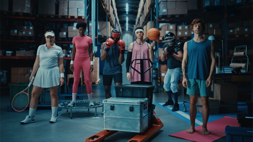 O filme apresenta diferentes grupos visualmente homogêneos, como equipes de startup com camisetas e looks modernos, todos seguindo o mesmo estilo. A narrativa, então, quebra essa uniformidade ao reencontrar esses mesmos personagens em momentos individuais de prática esportiva, revelando que, por trás da aparência coletiva, cada pessoa tem necessidades, ritmos e escolhas próprias.