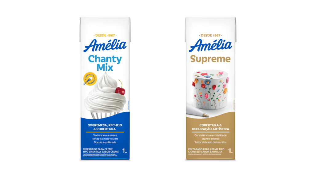 Em um design mais moderno, as novas embalagens dão protagonismo ao nome da marca, apresentando a chancela do ano de fundação, como símbolo de confiança, e o selo de “Chantilly Nº 1 do Brasil”, que destaca sua liderança na categoria. Além disso, trazem indicações de uso mais claras, diferenciando aplicações voltadas ao dia a dia e ao uso profissional na confeitaria.