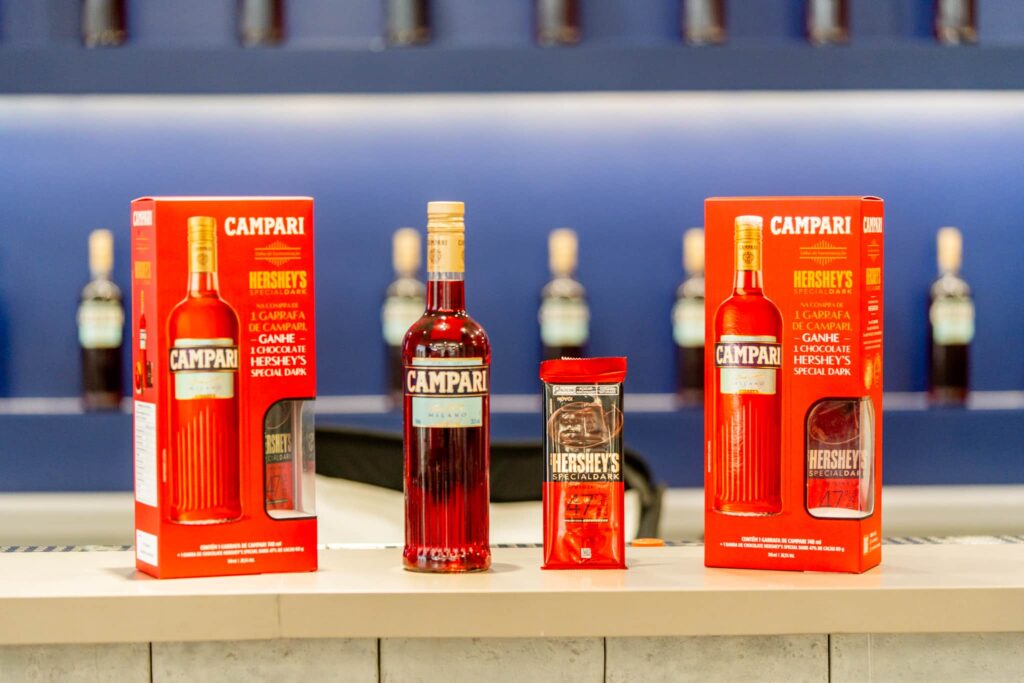 O pack traz uma garrafa de Campari 748ml e uma unidade de Hershey’s Special Dark 47% Original 80g, em uma embalagem especial que destaca o vermelho característico dos dois produtos, reforçando, no design, a sintonia entre seus sabores e perfis sofisticados.