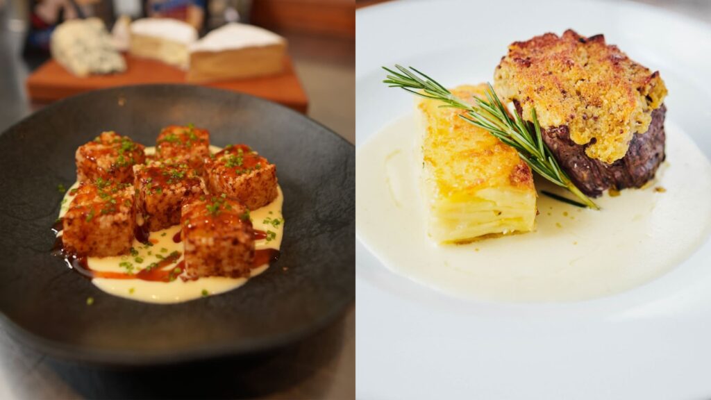No cardápio: Filé com crosta de Parmesão Reserva Faixa Azul, acompanhado de Gateau de Batatas e Fonduta de Gorgonzola Faixa Azul.