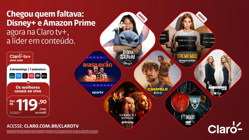 A Claro tv+ passa a integrar as assinaturas de Prime Video e Disney+ em sua oferta principal, reunindo, de forma inédita, os seis maiores serviços de streaming do mercado ao lado dos principais canais de TV aberta e por assinatura, tudo em uma só experiência.