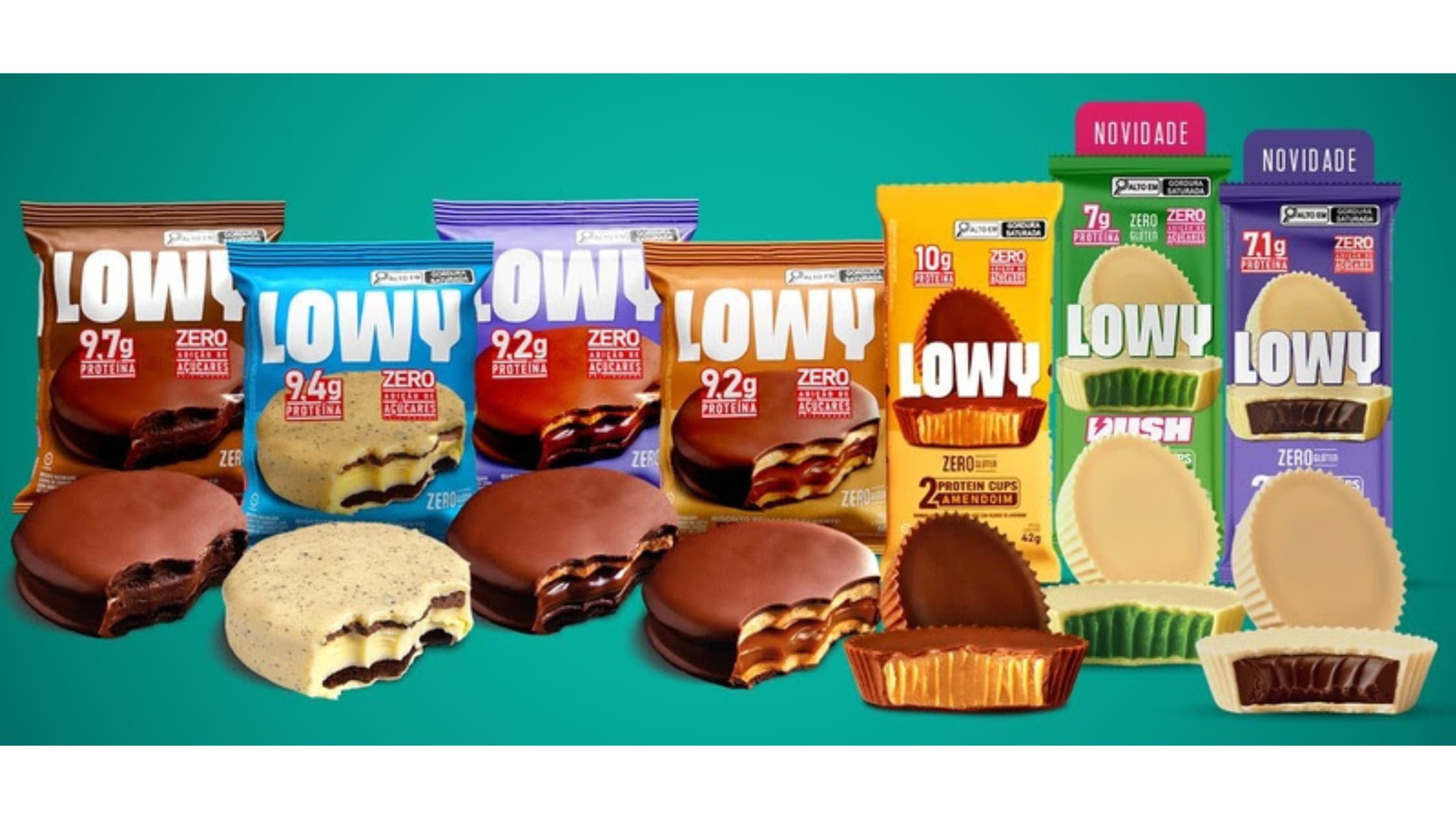 O portfólio da marca contempla biscoitos recheados cobertos em quatro versões – cookies’n cream, doce de leite, triplo chocolate e avelã -, além de LOWY Protein Cups, que já estava disponível no mercado no sabor chocolate ao leite recheado com amendoim e, agora, conta com lançamentos recentes, como chocolate branco recheado com avelã e também chocolate branco recheado com matcha, este último em collab com a Push. Todos são zero glúten, zero açúcar e com alto teor de proteína.
