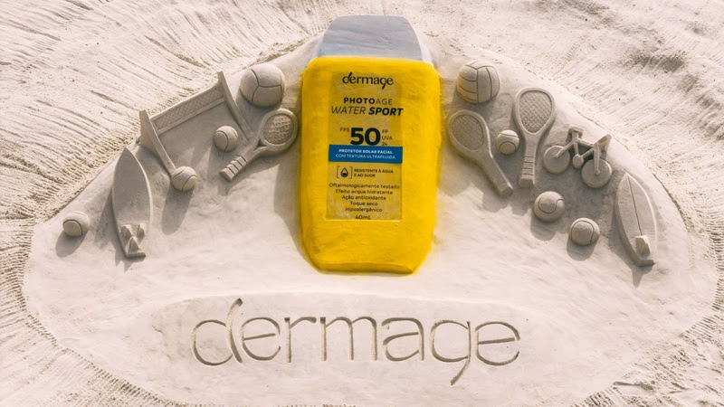 Para apresentar o lançamento do Photoage Water Sport, seu novo protetor solar facial, a Dermage promoveu uma ação especial na Praia de Copacabana, no Rio de Janeiro, nesta quarta-feira (22). A marca convidou o artista plástico Rogean Rodrigues, conhecido por suas esculturas de areia há mais de 30 anos, para criar uma obra em formato do novo protetor solar.