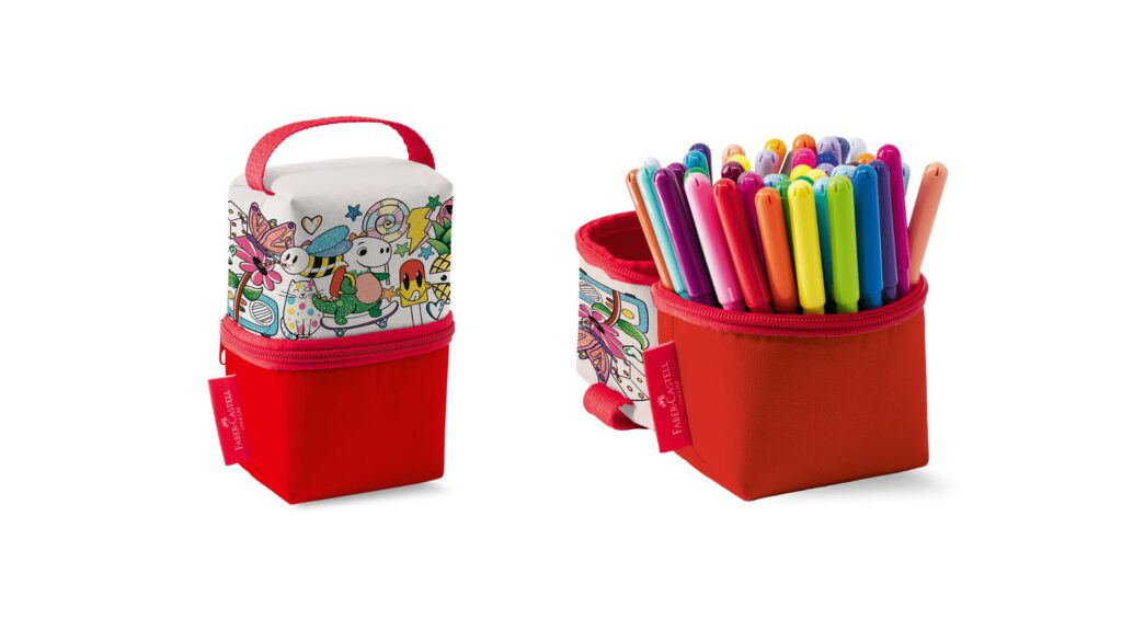 Além de ampliar a variedade de cores para as canetinhas, a Faber-Castell também desenvolveu um estojo de tecido exclusivo para acompanhar o kit, facilitando a organização e a praticidade no uso do material: ideal para transportar as canetinhas com facilidade, o estojo também funciona como um organizador de mesa, mantendo tudo em ordem e sempre ao alcance das mãos. O design da embalagem foi inspirado na tendência dos desenhos divertidos do estilo doodle, tornando o produto ainda mais atrativo.