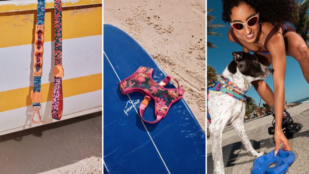 Cada detalhe foi pensado: alças de controle, tiras refletivas e formatos ergonômicos. Além de coleiras, guias e peitorais, a linha traz itens de lifestyle coloridos, como capa de chuva dobrável para passeios inesperados, o resistente Tuff Bowl com a icônica estampa de banana da FARM Rio, cinto para corrida com mãos livres, brinquedo em formato de flor que também funciona como frisbee, e pins colecionáveis em formatos divertidos.