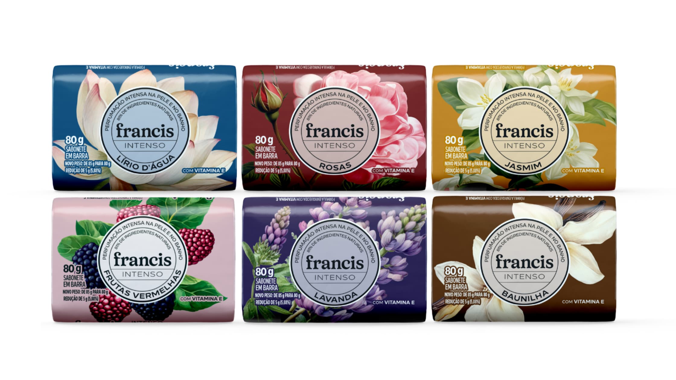A marca também apresenta novas embalagens para a linha Francis Intenso, reforçando seu portfólio de fragrâncias marcantes. A linha reúne fragrâncias queridinhas do público, como Baunilha, Frutas Vermelhas, Jasmim, Lavanda, Lírio d’Água e Rosas, perfeitas para quem busca um banho ainda mais perfumado.