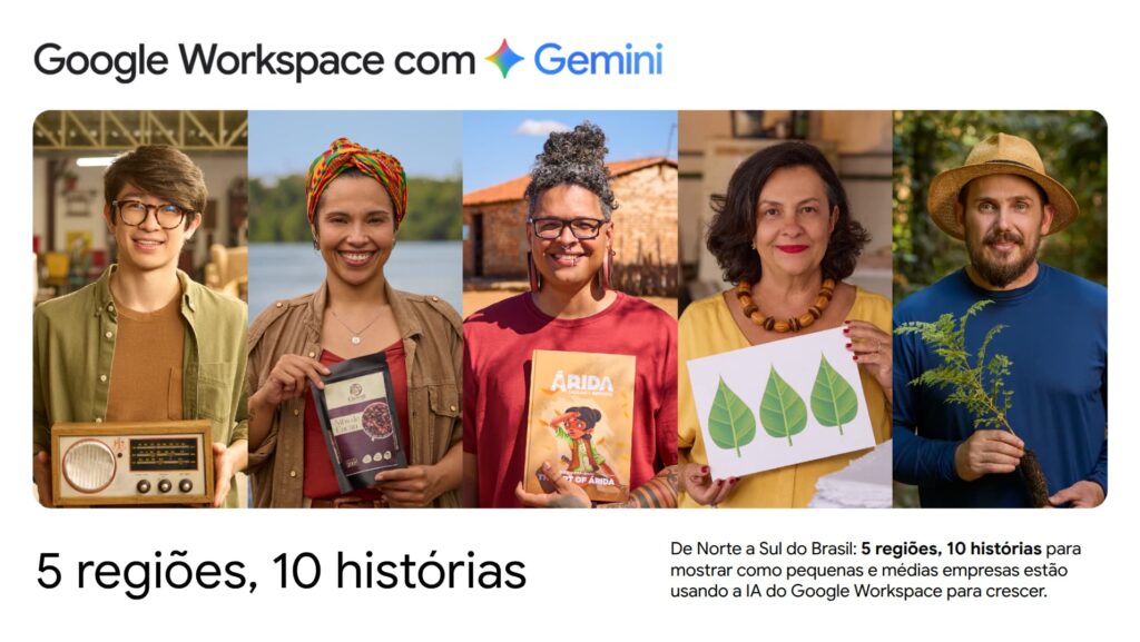 No intuito de destacar a inovação através da IA, a coragem e o trabalho duro dos pequenos empreendedores no Brasil, o Google Workspace está lançando a campanha “5/10 – 5 regiões, 10 histórias”. Voltada para Pequenas e Médias Empresas (PMEs), a ação estreia em emissoras de TV e também no digital neste domingo (5), em comemoração ao Dia Nacional da Micro e Pequena Empresa, mostrando dez histórias de pequenas empresas das cinco regiões do Brasil que já estão usando o Gemini – o modelo de IA mais avançado do Google – quando ele está integrado em soluções de produtividade e colaboração do Google Workspace, que milhares de empresas já usam no dia a dia.