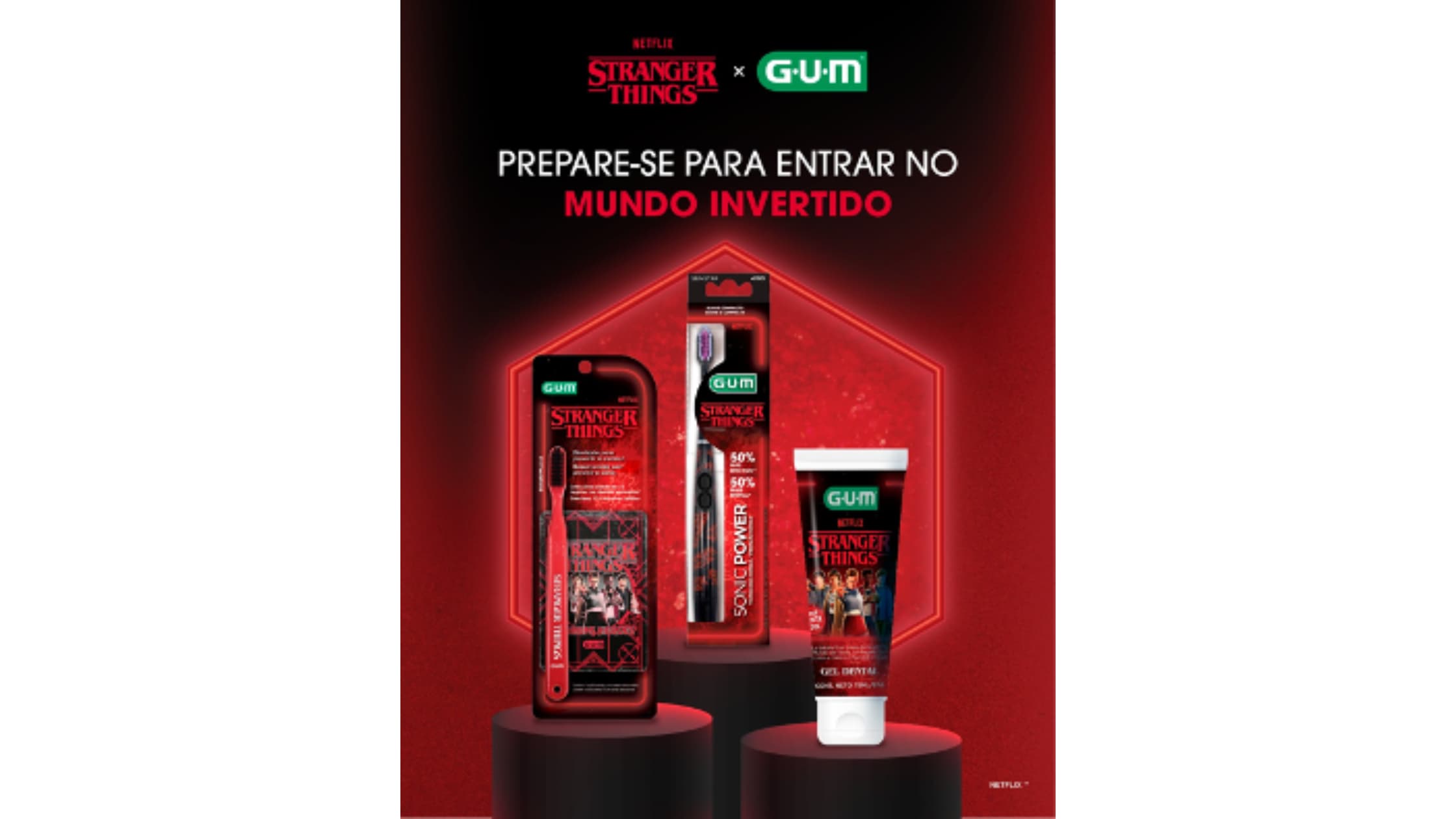 Entre os lançamentos, que acompanham cards exclusivos da franquia, estão a Escova Dental Classic GUM Stranger Things, com cabeça compacta e design exclusivo Dome Trim, que possui fileira central de cerdas elevadas capazes de penetrar suavemente abaixo da linha da gengiva; Escova Dental Sonic Power GUM Stranger Things, que oferece mais de 12.000 vibrações por minuto para uma limpeza profunda e eficaz; e Gel Dental com Flúor GUM Stranger Things (97 g), com sabor menta cool e fórmula com 1.100 ppm de íon flúor, garantindo hálito fresco e proteção contra cárie.