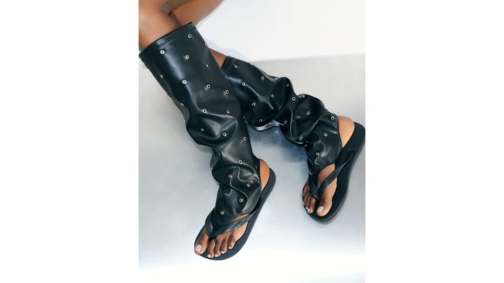 O modelo Top preto é combinado com polainas de couro artesanais da Gimaguas, ganhando um toque sofisticado. Finalizado com ilhoses prateados, uma assinatura da marca baseada em Barcelona, o acessório é fácil de vestir, ajustando-se ao redor dos pés e dos dedos. Por meio de textura, contraste e volume, o design transforma a icônica silhueta de Havaianas em uma peça transacional, feita para ser usada o ano todo, levando o espírito do verão para novos contextos.