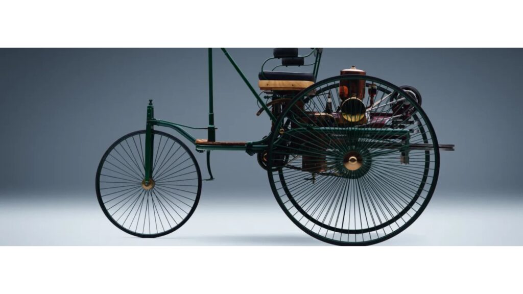Benz Patent Motorwagen, 1886: o engenheiro Carl Benz cria uma invenção revolucionária com este modelo de três rodas, o primeiro automóvel a combinar um motor a combustão (0,55 kW/0,75 cv) com um chassi leve e moderno em um conceito integrado.