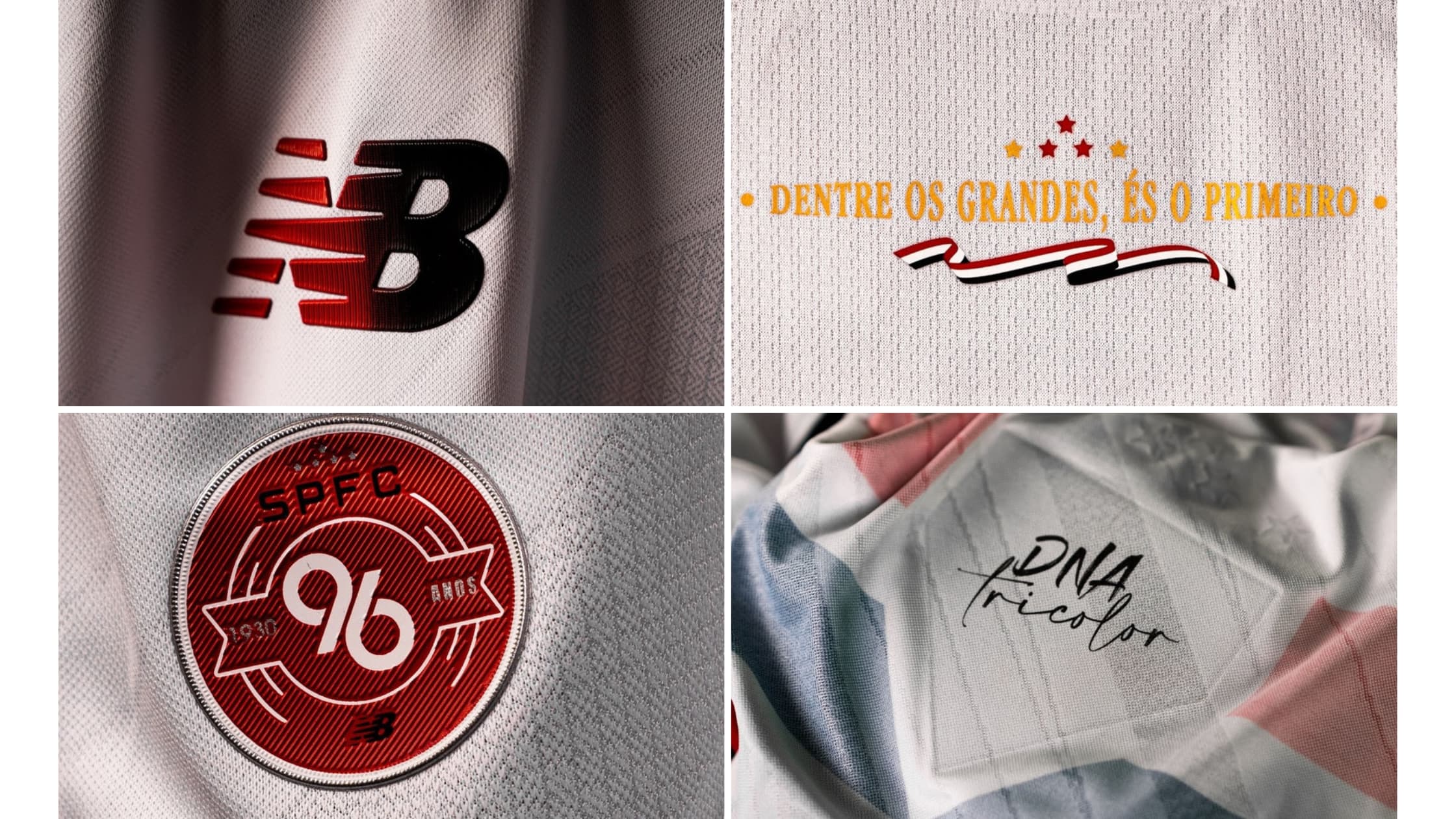 Na identidade visual do novo modelo, também emerge o caráter contemporâneo da camisa. O logo da New Balance aparece em degradê em vermelho e preto, criando um contraste com o branco predominante do uniforme. Na parte de trás, abaixo da gola, um transfer comemorativo traz uma das frases mais emblemáticas do hino do clube — Dentre os Grandes, És o Primeiro — reforçando a grandeza e o protagonismo do São Paulo no futebol nacional e internacional.