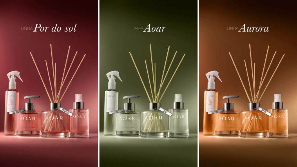 O nome Aoar surgiu de um processo de cocriação entre a Pande e o cliente, evocando o ato de respirar e a leveza do que não se vê, mas se sente. As quatro fragrâncias originais, Aurora, Pôr do Sol, Aura e Aoar, foram desenvolvidas em colaboração, conectando aroma, cor e emoção em uma narrativa sensorial única, onde cada detalhe expressa o equilíbrio entre estética e propósito.