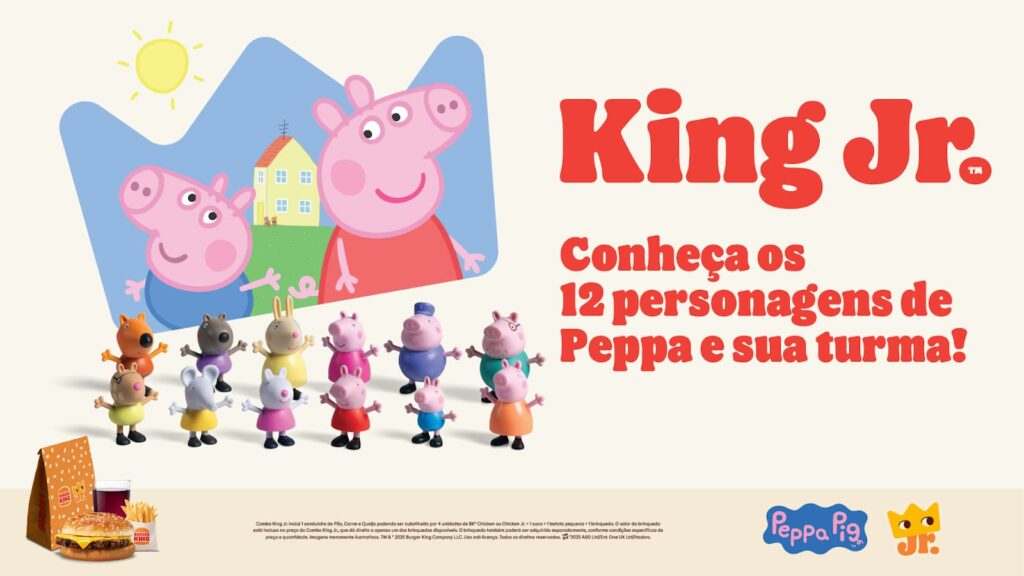 A porquinha Peppa Pig, fenômeno mundial entre as crianças, traz toda a sua turma para o Burger King e convida as famílias para momentos de pura diversão. A partir do dia 14 de maio, na compra do Combo King Jr., os fãs desta adorável história infantil poderão escolher entre 12 personagens, sendo eles: Peppa, George, Mamãe Pig, Papai Pig, Emily Elefante, Vovô Pig, Vovó Pig, Suzy, Danny, Freddy, Dona Coelha e Pedro Pony.