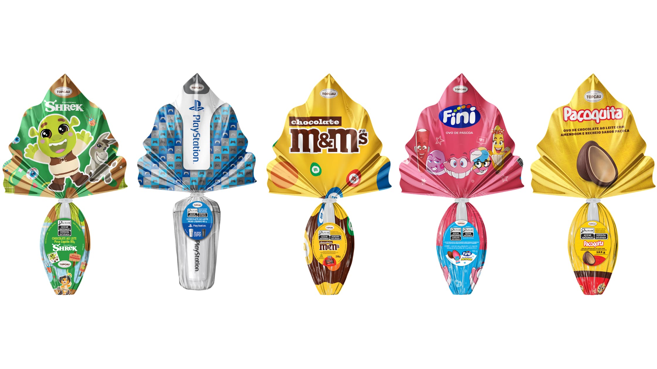 A linha de licenciados faz um brinde à nostalgia com os personagens clássicos, como Snoopy, em versão astronauta; Scooby-Doo, que acompanha uma pelúcia estojo; e Patolino, representado por um fantoche divertido. Além deles, o portfólio resgata o carinho do público pelas Meninas Superpoderosas, com bolsas exclusivas, e pela dupla mais divertida da Fenda do Biquíni: Bob Esponja e seu fiel amigo Patrick, que chegam em formato de pelúcia para celebrar a data. Todos acompanham ovos de chocolate ao leite com drageados crocantes ao leite.