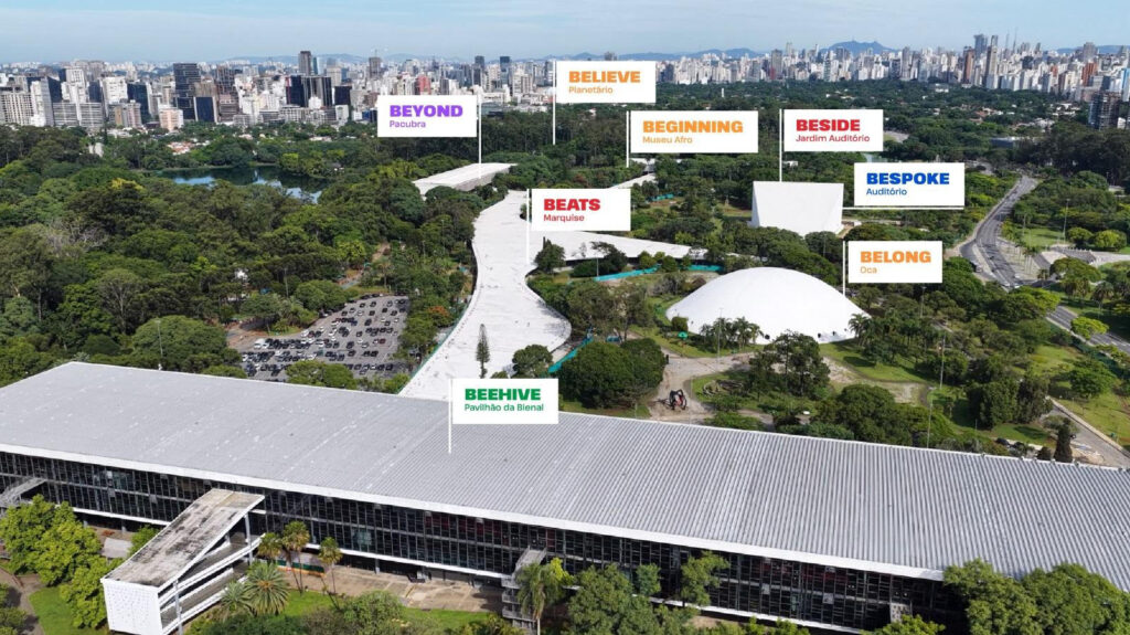 Uma lógica que se traduz na ocupação do Parque Ibirapuera como um sistema integrado de experiências, inspirado na dinâmica da mobilidade urbana. Os diferentes espaços do parque funcionam como “estações” interligadas, criando uma jornada imersiva que orienta a circulação do público e articula conteúdos, encontros e ativações. Nesse circuito, que combina debates, arte, cultura, gastronomia e apresentações musicais, o SP2B se organiza em oito espaços temáticos que abrigam 30 palcos, distribuídos entre Bespoke (Auditório Ibirapuera, 1 palco), Beyond (Pacubra, 6 palcos), Belong (Oca, 4 palcos), Beginning (Museu Afro, 5 palcos), Believe (Planetário, 1 palco), Beehive (Bienal, 8 palcos), Beats (Marquise, 4 palcos) e Beside (Jardim do Auditório, 1 palco). É a partir dessa arquitetura que o evento propõe não apenas apresentar tendências, mas reorganizar a forma como essas transformações são entendidas.